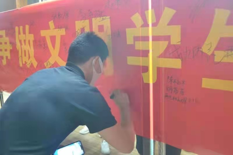 活动首先由学生处处长祖慧峰通报了本学期校园违纪情况,因酗酒等行为引发的严重不良后果,祖处长强调,当代大学生要养成积极健康的生活方式,远离烟酒。其次,体育系党总支书记董鲜玲对体育系全体学生进行教育,让学生深刻意识到吸烟饮酒等不良风气所带来的负面影响,同时强调体育教育系的学生作为未来的教师,更应该是师德示范者,应以身作则,树立良好的榜样。接着刘朝兴同学作为学生代表进行宣誓,表示让我们一起行动起来,坚决抵制烟酒,积极营造无烟校园,养成健康文明的生活习惯。随后,由各寝室代表向董鲜玲书记递交本寝室拒绝烟酒承诺书。活动最后,全体师生在“争做文明学生,共创和谐校园——拒绝烟酒,从我做起”条幅上签名,以此来提醒大家养成良好的生活习惯,远离烟酒,做一个朝气蓬勃的有志青年。