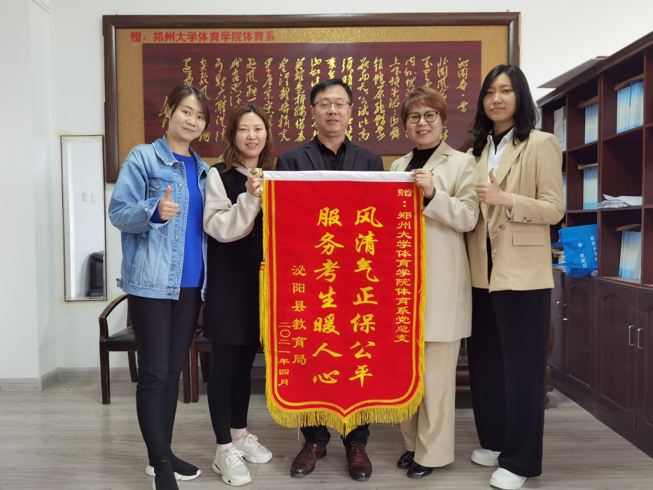 4月25日上午,郑州大学体育学院体育系收到了驻马店泌阳县教体局送来的锦旗。鲜红的锦旗上“风清气正保公平 服务考生暖人心”14个金色大字格外醒目,这是实习单位对我系学生实习工作的充分肯定和认同。