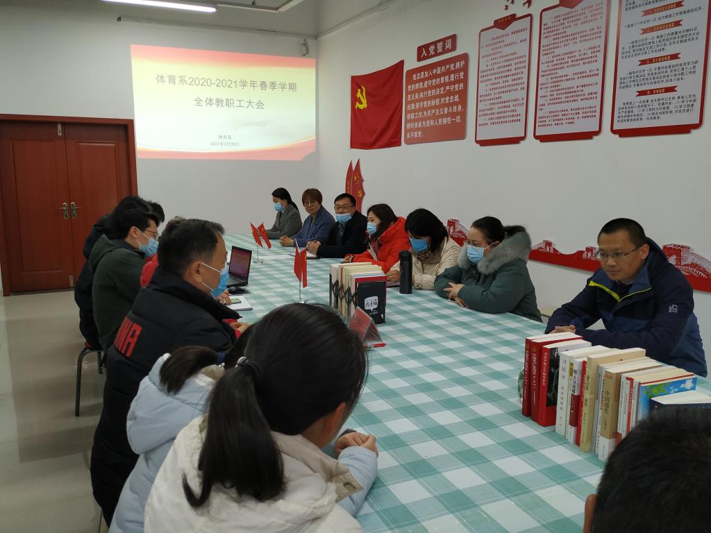 为确保新学期各项工作有序开展,2月26日上午9:00,体育系在会议室召开2020-2021学年第二学期春季开学工作会议,全体教职工参加,会议由系主任张庆来主持。