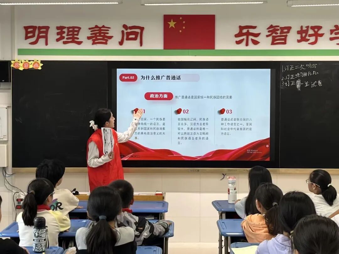活动紧扣四大板块:从“什么是普通话与规范字”入手,用汉字卡片演示规范书写;讲“为什么推广普通话”时,以方言沟通小情景,让孩子们懂其对民族团结的意义;“常见易错字”环节,“打烊(yàng)”“龟裂(jūn)”等字词成抢答焦点,错误读音在欢笑中纠正;最后“同诵一首诗,同唱一首歌”,学生与孩子齐诵《春晓》,共唱经典,标准发音回荡校园。