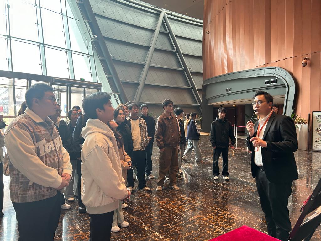 随后,学子们前往郑州大剧院。这座兼具艺术美感与文化底蕴的建筑,让大家感受到浓厚的艺术氛围。在工作人员引导下,大家参观了歌剧厅、音乐厅等核心功能区域,了解剧院的建筑设计理念、声学原理及运营模式。部分学子还现场聆听了经典音乐片段赏析,悠扬的旋律与专业的讲解相结合,让大家近距离感受艺术魅力,提升了审美素养与文化感知力。