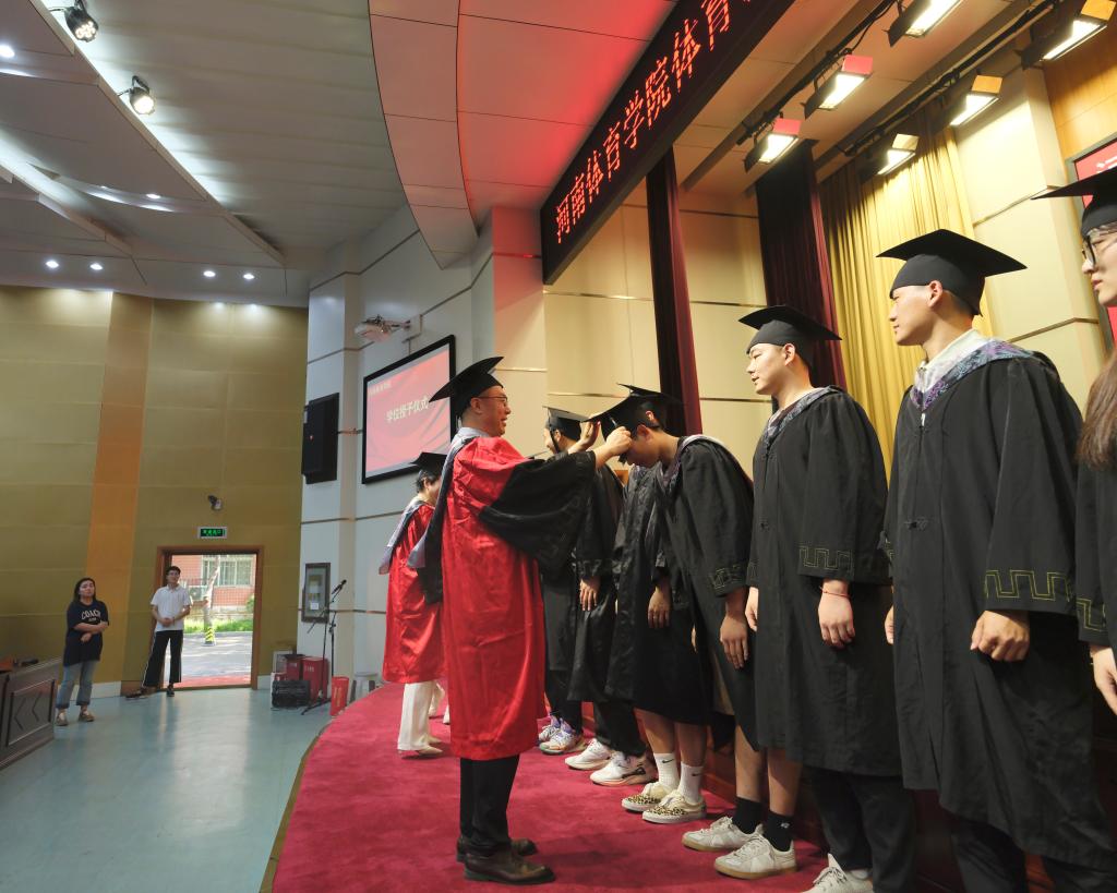 随后教师代表冯甜为2024届全体毕业生送上真诚祝福,学生代表卢增乾代表全体毕业生发言。系党总支书记董鲜玲、主任张庆来为获得学士学位的毕业生一一拨穗正冠,授予学位证书。